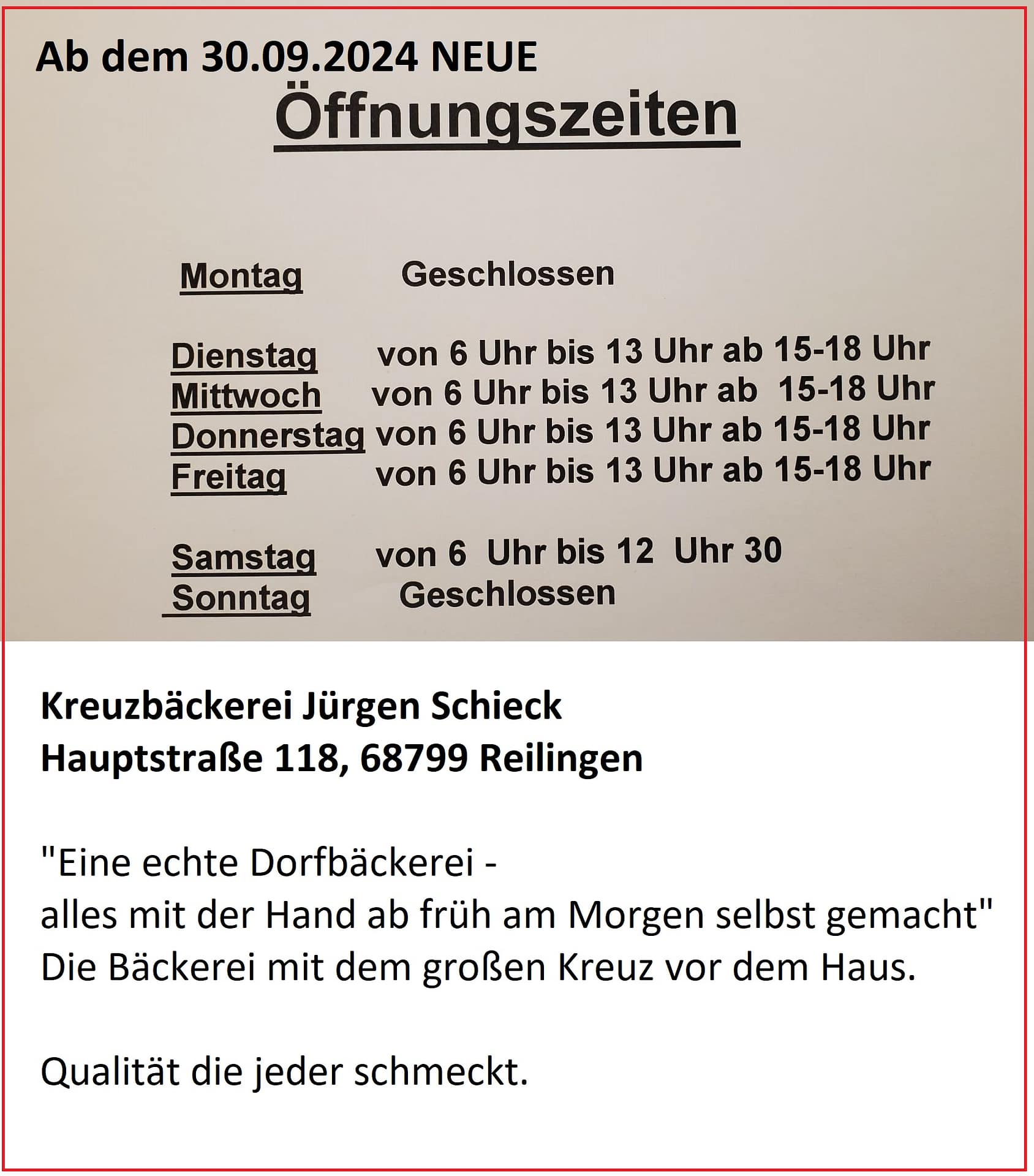 Öffnungszeiten ab 30.09.2024 Bäcker Schieck Kreuzbäcker Reilingen