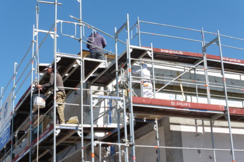 Am Wärmeverbundsystem der Außenwand wird letzte Hand angelegt.